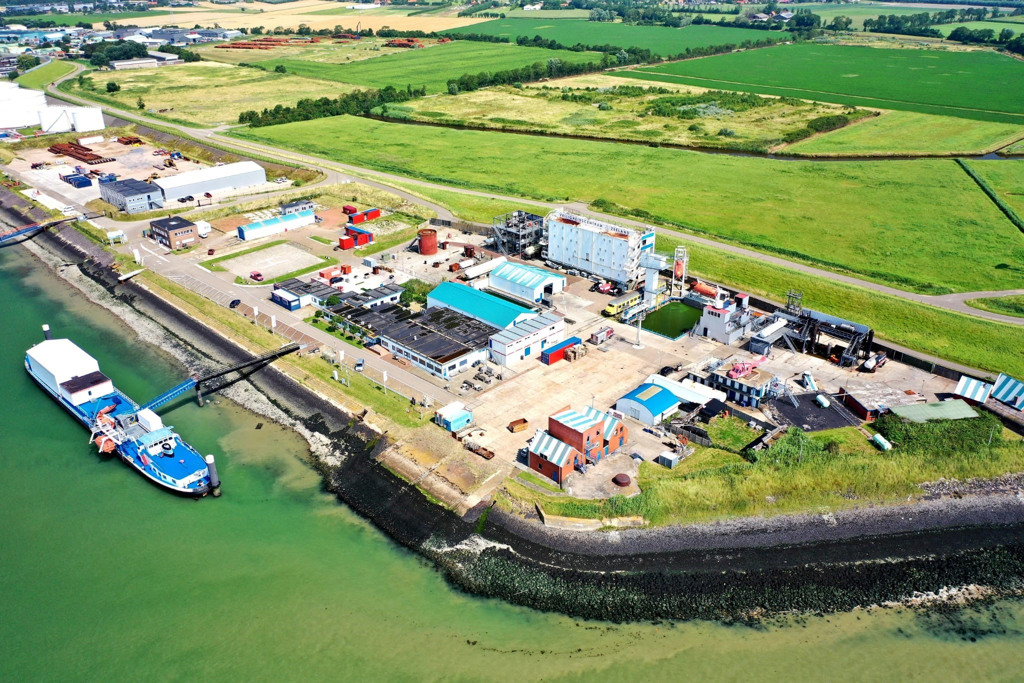 Brandoefenterreinen, overlevingstraining op open water, evacuatietorens en simulatorruimtes maken realistisch trainen mogelijk.